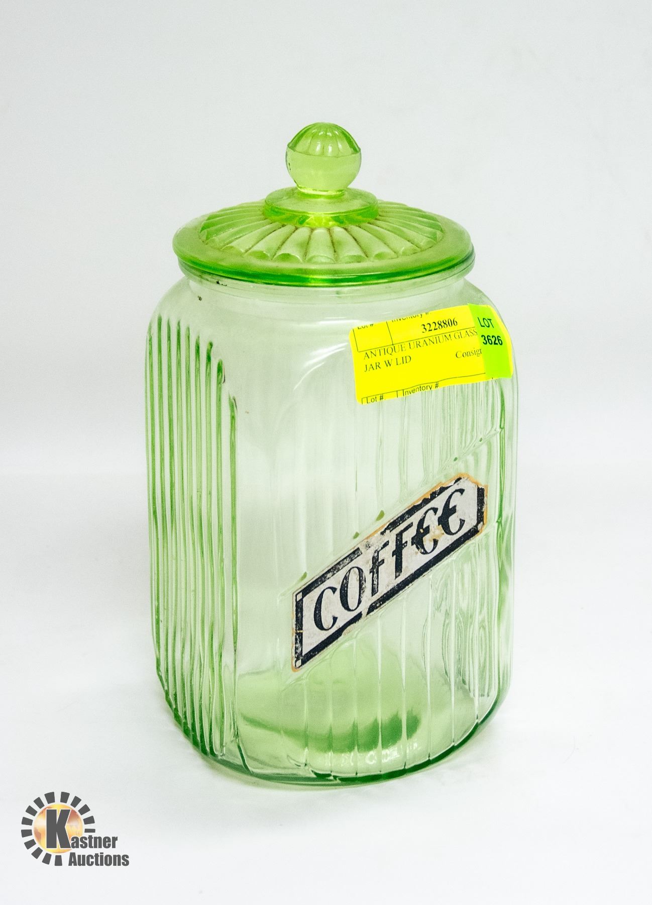 ANTIQUE URANIUM GLASS COFFEE JAR W LID