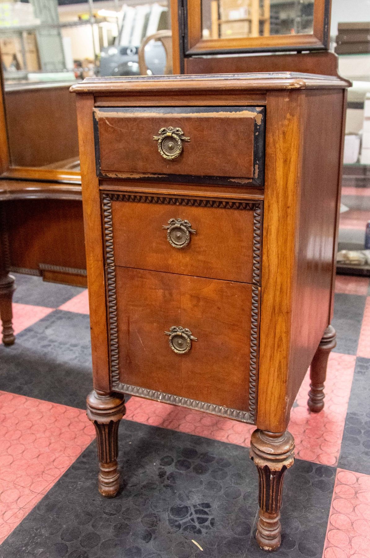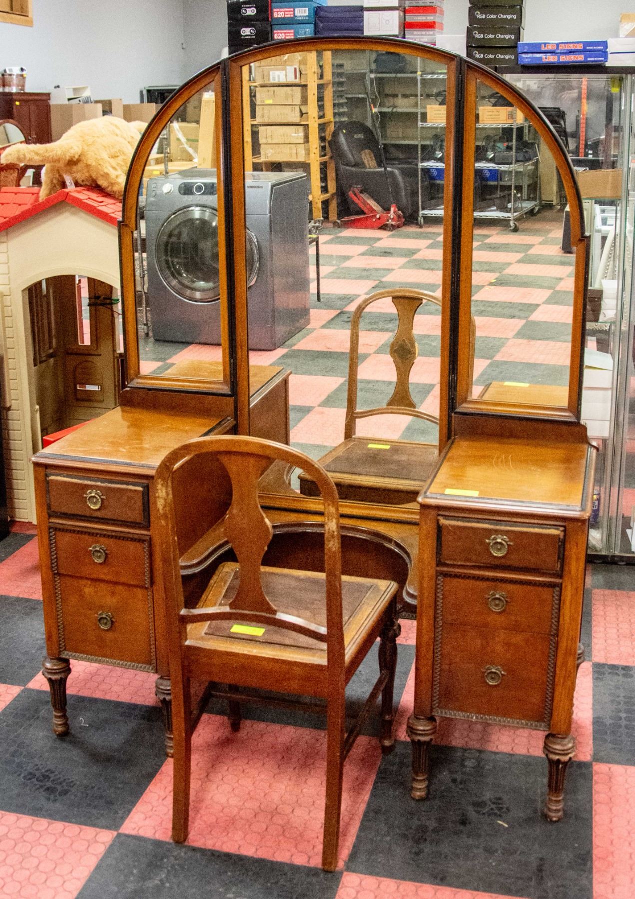 ANTIQUE VANITY WITH 3 WAY MIRROR AND CHAIR