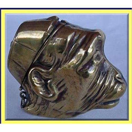 Unusual antique vesta case / match safe in the form of a brass monkey head. Made in England, 19th century.