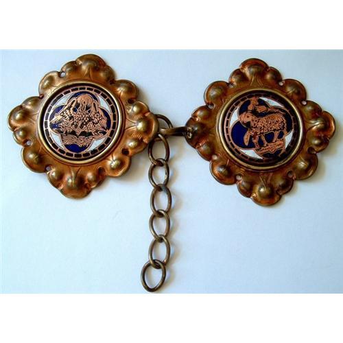 VICTORIAN CLOKE CLASP.6"WIDE NOT COUNTING THE CHAIN.I THINK THAT ROUNDELLS ARE FRENCH ENAMELS.