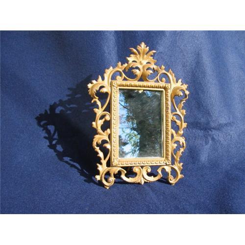 LOVELY VICTORIAN DRESSING TABLE MIRROR WITH GOLD CAST IRON FRAME. GOOD CONDITION AND VERY VICTORIAN! MEASURES 12" HIGH AND 8" WIDE. NICE FOR DECORATIVE PURPOSES OR GIFT. SLIGHT PAINT WEAR FROM USE