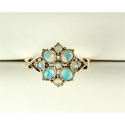 This Antique Victorian Style ring is 9K Yellow Gold and it features a cluster of 9 GENUINE OPALS. The ring is a Size 8 1/4 and it can be resized larger or smaller.