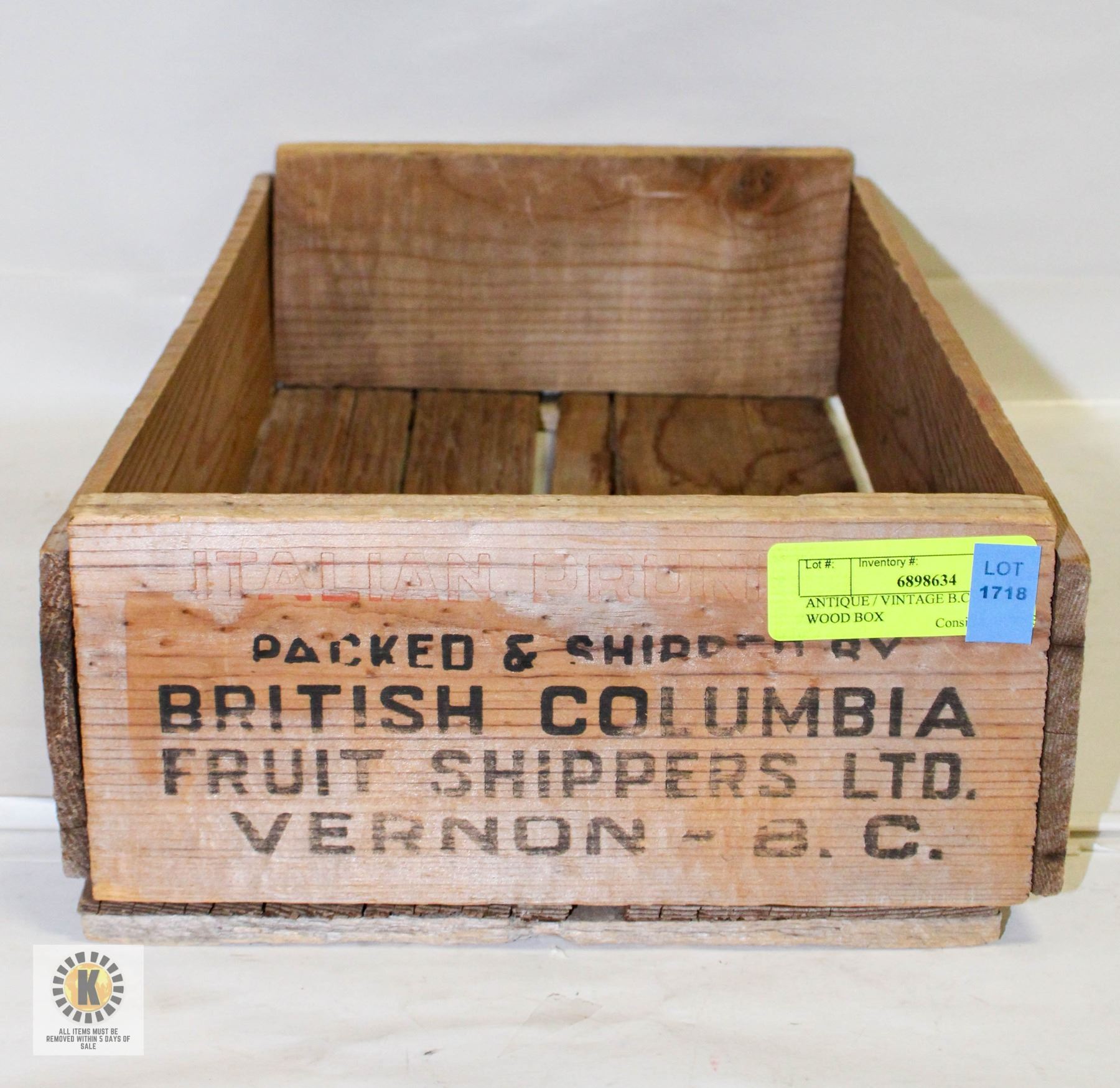 B.C. FRUIT SHIPPERS LTD, VERNON; (ITALIAN PRUNE LABELLED) 10X17.5X5" TALL **ALL ITEMS MUST BE REMOVED BY 5PM SATURDAY, MARCH 29TH 2025. ALL REMAINING ITEMS WILL BE SUBJECT TO A $6.00 PER DAY STORAGE CHARGE. ANY ITEMS REMAINING AFTER MONDAY, APRIL 21ST 2025 WILL BE CONSIDERED FORFEITED. NO REFUNDS WILL BE ISSUED FOR FORFEITED ITEMS. TO SCHEDULE A PICK UP APPOINTMENT CLICK HERE