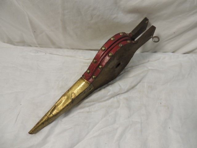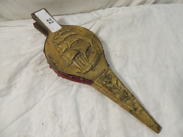 FIREPLACE OR OTHER BRASS COVERED, LEATHER WORKING BELLOWS BLOWER, AS SHOWN.