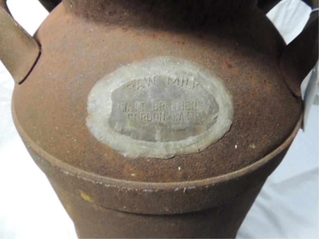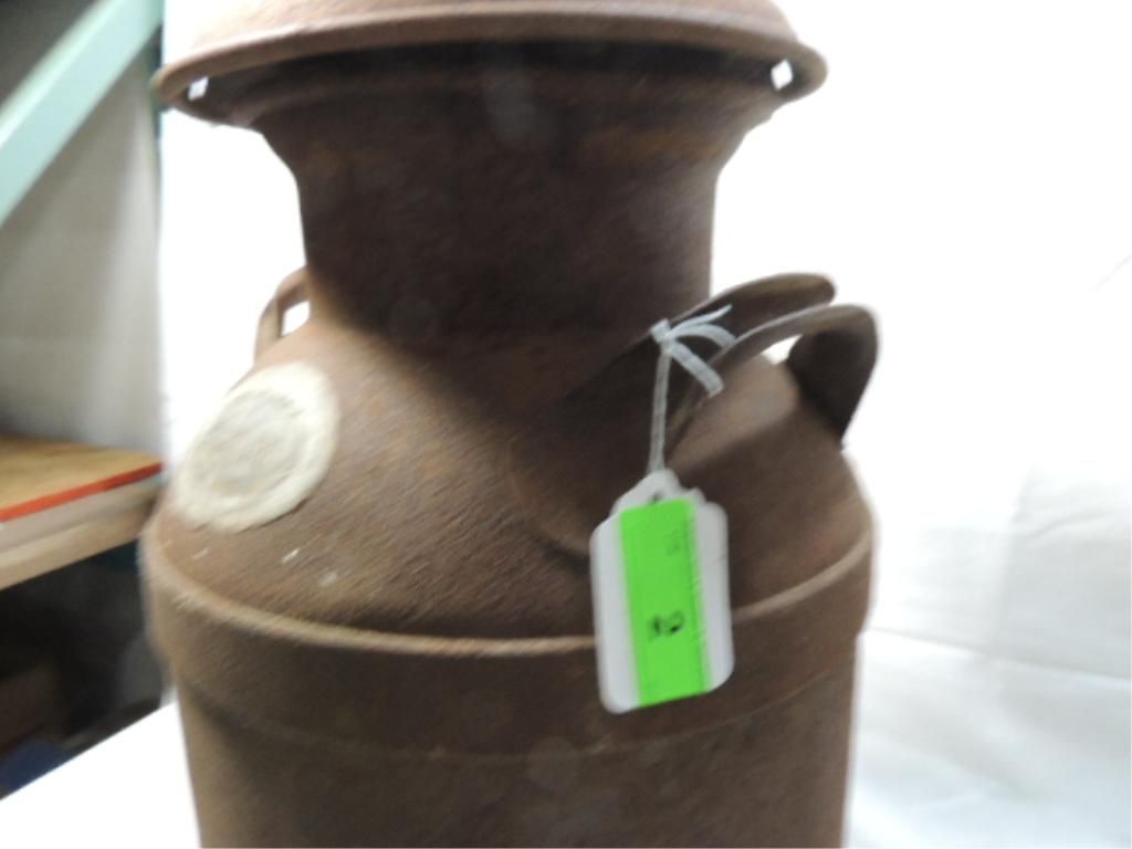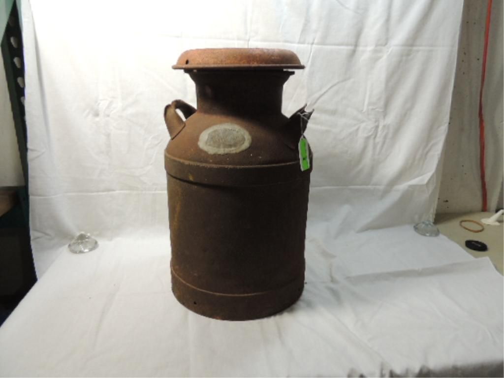 NICE OLD MILK CAN, STANDING 22" TALL, WITH NICE NAME PLATE, AS SHOWN. SEE THE PICTURES FOR DETAILS.