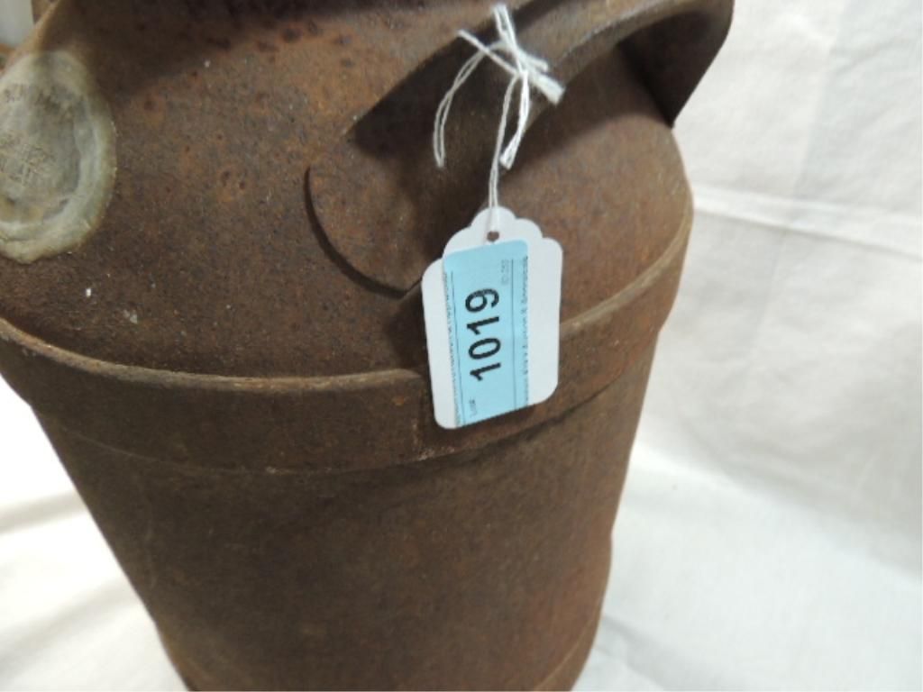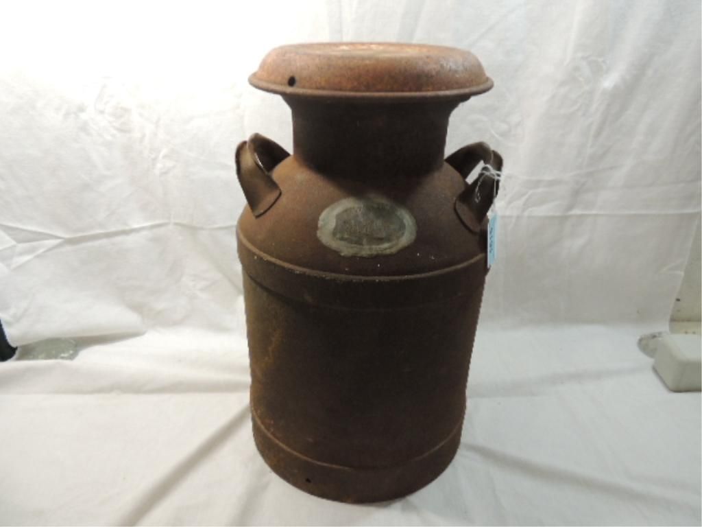 NICE OLD MILK CAN, STANDING 22" TALL, WITH NICE NAME PLATE, AS SHOWN. SEE THE PICTURES FOR DETAILS.