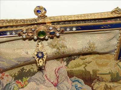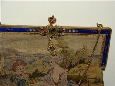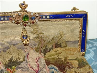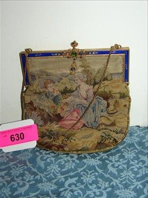 HANDBAG WITH NEEDLEPOINT IMAGE OF GATHERING WOMAN AND CHILD. AS SHOWN. VIEW PICTURE FOR DETAIL.