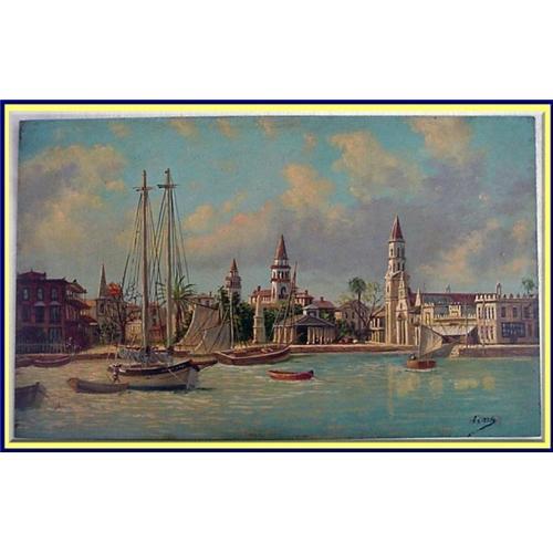 Very fine painting by superior artist. Done on metal. Wonderful detail - from the minute people who populate the town to those working on the boats and sailing ships. A variety of Mediterranean trees add colour to the town, almost bleached white and red in the sun. Fabulous treatment of the sky. Light blues of sky and sea make this a particularly attractive painting.