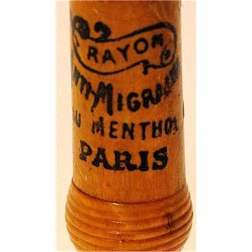 ANTIQUE MEDICINE - CARVED WOODEN CASE.<P>Carved case for menthol...antique smelling salts...for migraines.<P>Possible predecessor of modern inhalers.<P>Polished wood, carved base, printed top.<P>"Rayom, Anti-Migraine, Au Menthol, PARIS"<P>Top screws off to access chambers where menthol was inserted.<P>Measurements: 2 3/8 inches long; 3/4 inch wide; 11/16 inch deep.<P>PARISIAN STYLE FOR GLOBAL CONDITION.