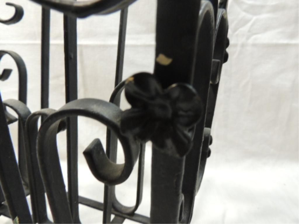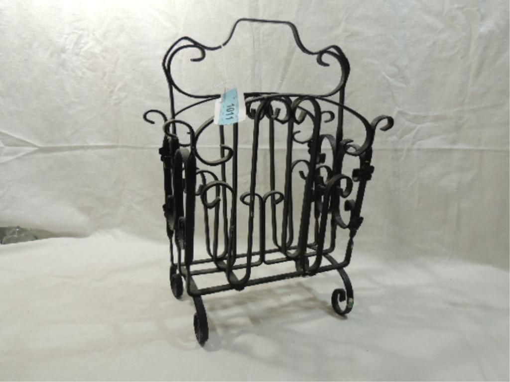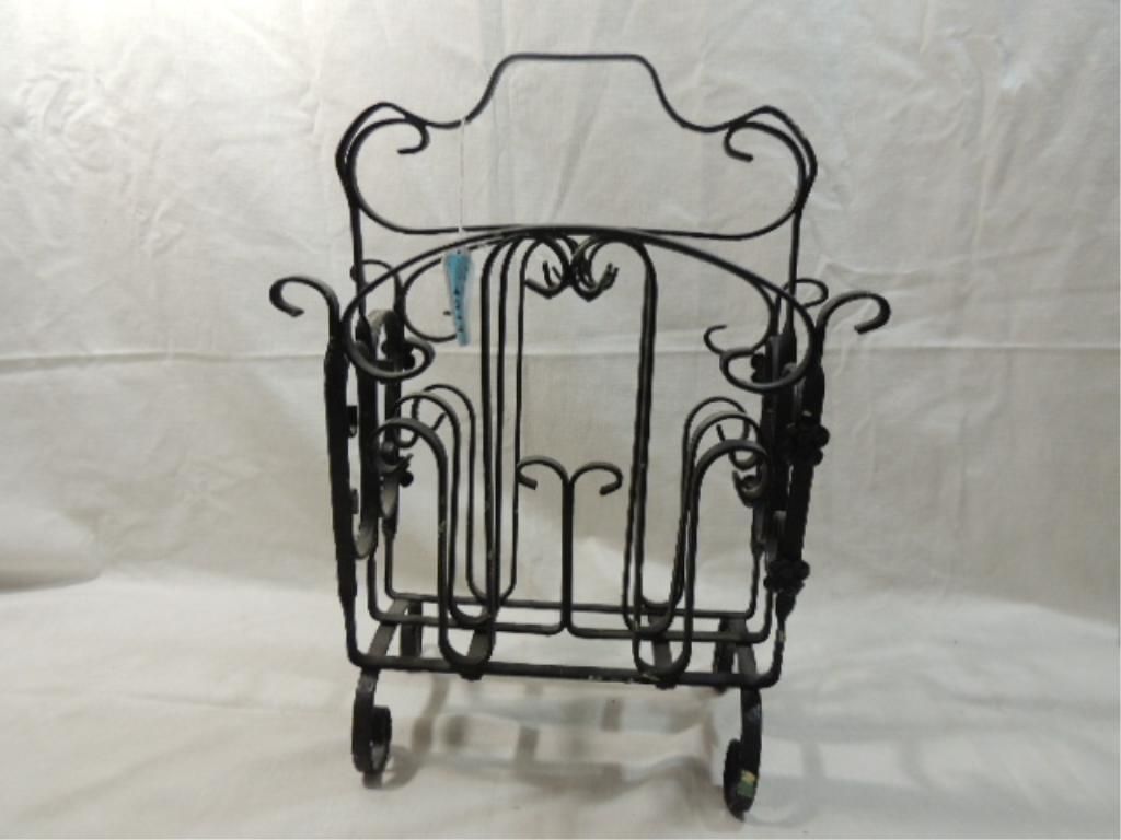 NICE VINTAGE IRON MAGAZINE RACK, MEASURES 15" X 7" AND 19" TALL. AS SHOWN. SEE PICTURES FOR DETAILS.