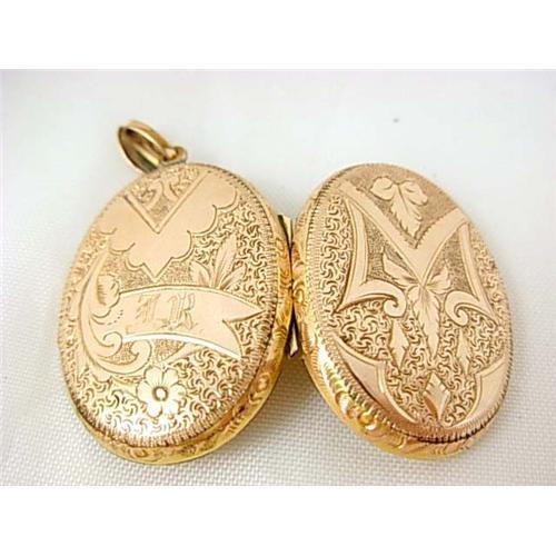 A very fine antique early victorian or edwardian period gold filled unmarked locket in very good condition. It is monogrammed on the front very lightly "FR". There is a small dent noted to the unmonogramed side at the top, but not very noticeable at all. The interior appears to be a very thin gold foil like material with mild cracking noted. A fabulous and very collectible heavily etched piece.