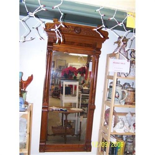Up for sale is an absolutely beautiful antique walnut decorative mirror. This by far is one of the prettiest mirrors. It?s in excellent condition. The patina is nice and rich in color. This mirror would look stunning above the right table. All it needs is a good home to go to that has the love and appreciation of antique furniture. I would almost say the mirror is an Eastlake style. Also if you see any glares or what appears to be lighter areas of this item, it is NOT the item. We have 52 lights in our antique and sometimes it's hard to capture pictures without some sort of glare. Also there is the flash in the digital camera that needs to be taken into consideration. Furthermore, the pictures to this mirror were taken during Xmas so there were lots of Xmas lights on during the time the pictures were taken of this mirror. This mirror is an Eastlake Style. It more than likely dates to the 1920s. Along the tow posts and under the molding crown, there is burled inlay. It's very hard to see in the pictures but it's there.