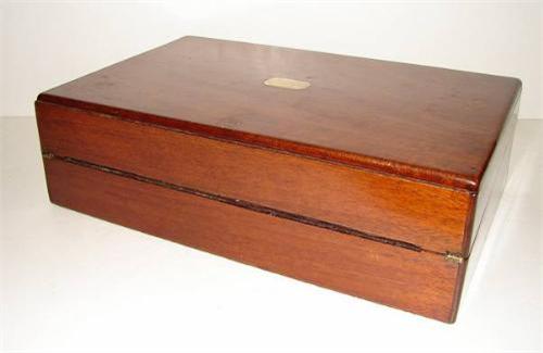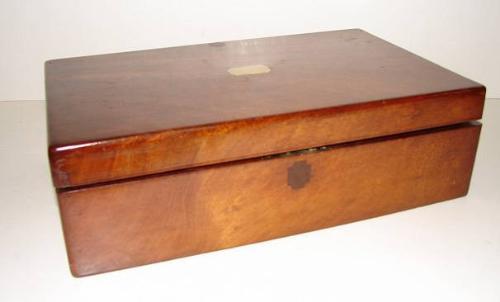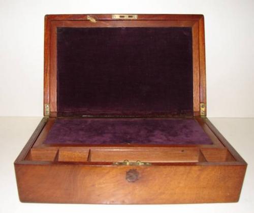 ANTIQUE WALNUT LAPDESK WITH SHIELD ESCUTCHEON AND PURPLE VELVET WRITING SURFACE. Excellent condition.