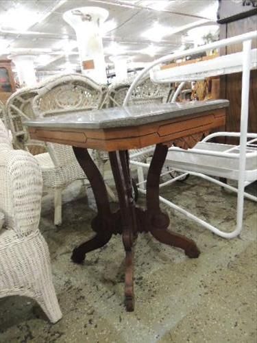 ANTIQUE WALNUT VICTORIAN GREY GRANITE TOP PARLOR TABLE. 30X22X29. AS SHOWN. VIEW PICTURE FOR DETAIL.
