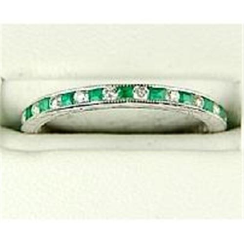 This ANTIQUE Style ETERNITY BAND is 18k White Gold and it features beautiful EMERALDS alternating with SPARKLING DIAMONDS. There is exquisite etching on the sides. This WEDDING BAND is a Size 6.