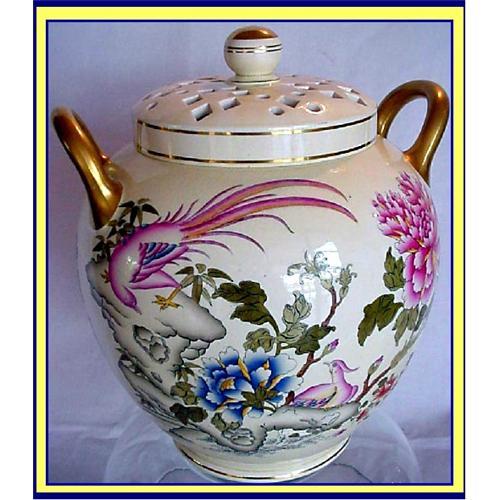 Wedgwood openwork porcelain potpourri, made England mid 19th century.<BR>11 1/2 inches high. <BR>2 handled, barrel form body in palest yellow / cream with superbly painted Chinoiserie style flowers, birds and blossoms in a naturalistically handpainted landscape with rocks and fence.<BR>Superb blue, pink, orange and Imari red Chrysanthemums, peonies and other small flowers and blossoms in a continuous floral ring. One side has a pair of long tailed exotic birds / <BR><BR>pheasants in pink and blue amidst a rocky outcrop. <BR>Lid, with round knop has geometric openwork pattern. Gilded handles on either side of body.<BR>Underneath has tiny impressed mark WEDGWOOD, handwritten red F485 and a small impressed symbol.<BR>Condition on the outside of the body is extremely good. Underneath is crazed and has a superficial hairline crack.