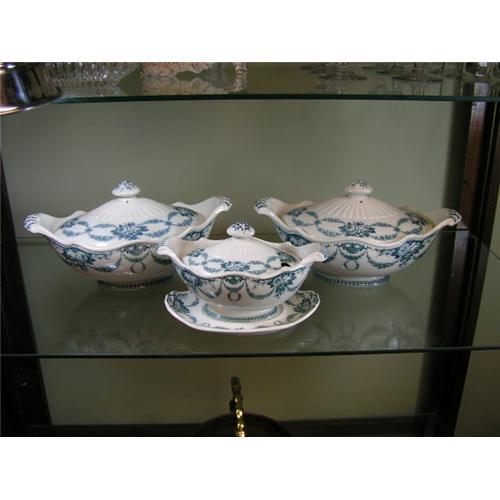 THESE ALL HAVE A LID TO THEM .WE HAVE A GRAVY TUREEN WITH LID AND TRAY [NO LADLE] THIS MEASURES 8 1/2" LONG.TRAY MEASURES THAT ALSO.THIS IS IN GOOD SHAPE I DO NOTE THE LID TO THIS GRAVY BOAT HAS A SMALL CHIP ON THE INSIDE LIP OF THE LID, THIS IS TINY AND MEASURES ABOUT 3/16THS" WHICH IS A REALLY SMALL CHIP.
