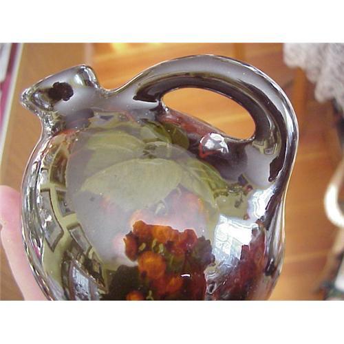 Beautiful antique Weller Louwelsa signed jug. This is a lovely example of Weller with a hand painted cherries, it was most difficult to photograph since the pitcher is so lustrous it reflects everything! The jug stands 5 ¼ inches high, it is in excellent condition, but for a small shallow flake (it actually looks like the glaze has worn off) on the spout, not distracting, otherwise just fine. Its clearly marked on the bottom with impressed marks. A most beautiful signed Weller pottery piece to add to your collection and enjoy displaying