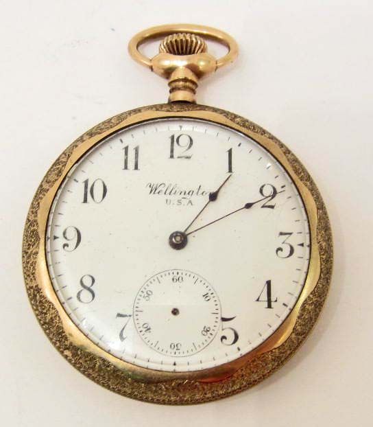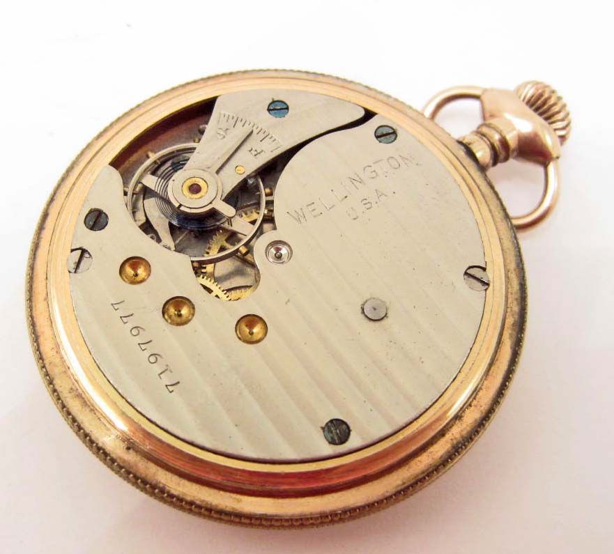 Backside of the case is marked WELLINGTON PEERLESS 5602405 on the inside. Watch movement is marked WELLINGTON U.S.A. 7197977. Approx 2" diameter. Starts to run and then stops. Missing the second hand.