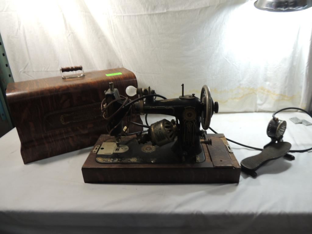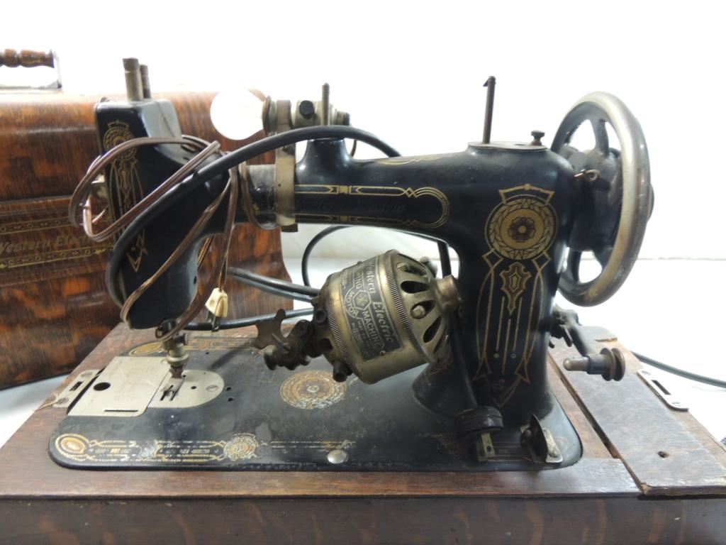 WESTERN ELECTRIC. SEWING MACHINE. EARLY 1900's WITH CASE TOMBSTONE CASE WOODEN CASE ELECTRIC SEWING MACHINE VICTORIAN SEWING MACHINE AS SHOWN SEE PHOTO FOR MORE DETAILS.