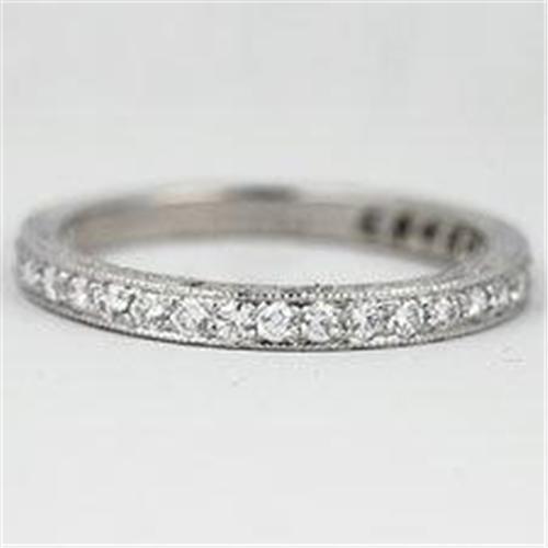 This ANTIQUE Style Wedding Band is 14k White Gold and it features 26 bead set DIAMONDS with a TOTAL WEIGHT = .40 CARATS! The Diamonds are all the FINEST 'G' Color and 'VS' Quality. The band is 2.4mm wide and it sits 1.9mm high above the finer. There is exquisite detailed design on the sides, and there is a milgrained edge as well. This beautiful Diamond Wedding Band is now a size 7 and it can be resized either larger or smaller.