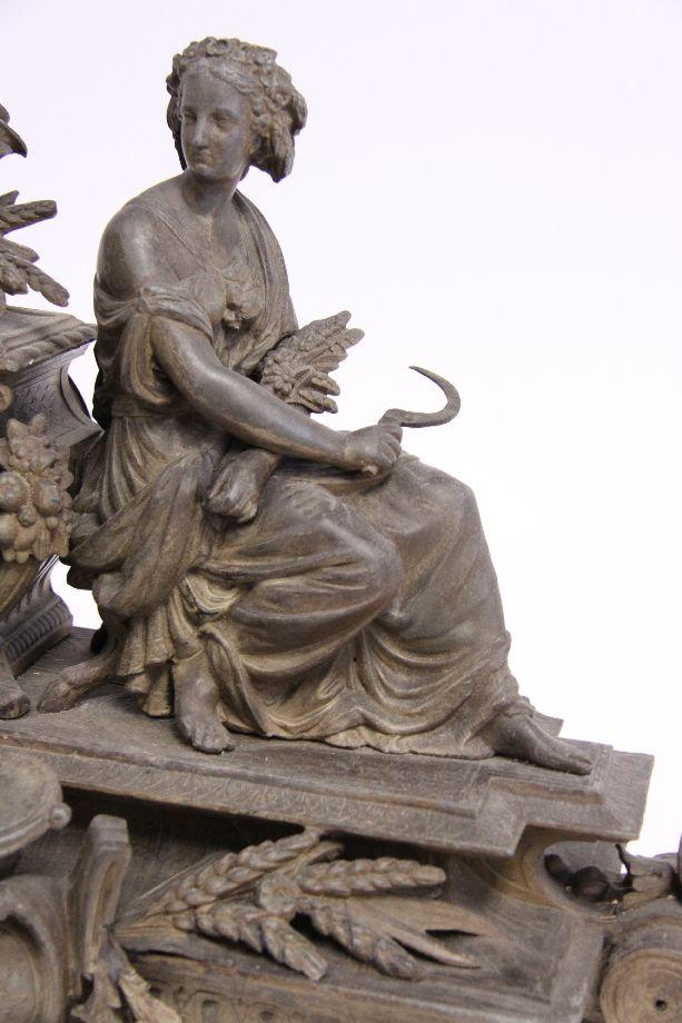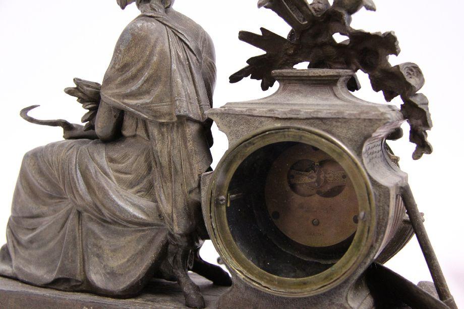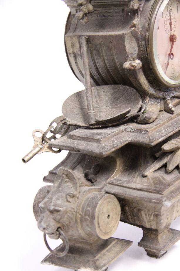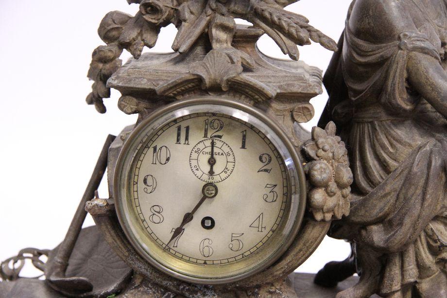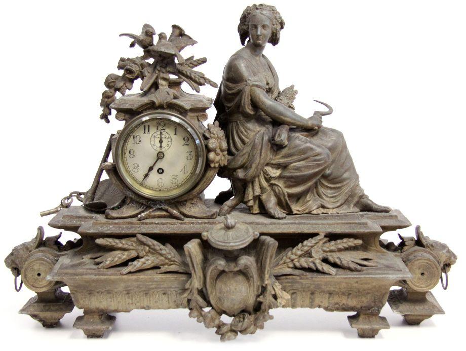 Metal-cast clock with a shield surrounded by a flower wreath placed at the bottom middle. It is ornately decorated with a woman sitting beside the clock face. Her head is wreathed in flowers and wheat. Doves sit above the clock with trumpets. Complete with key. One of the back legs is missing it's footing. It stands well nonetheless.