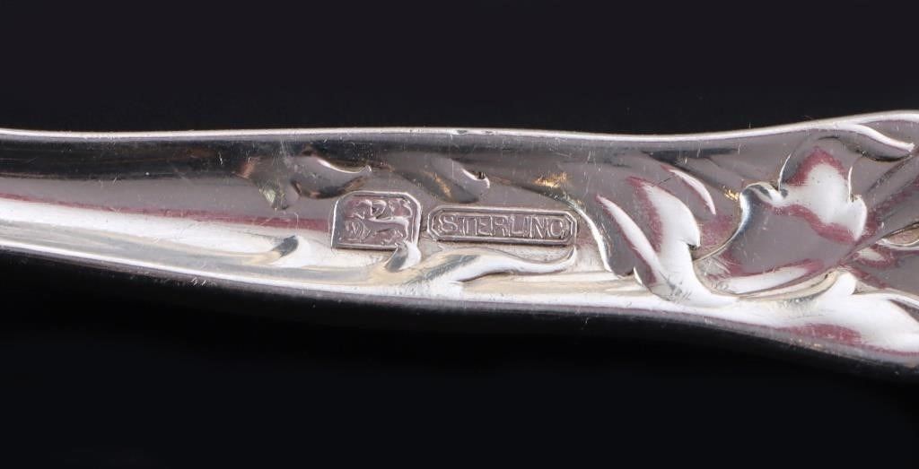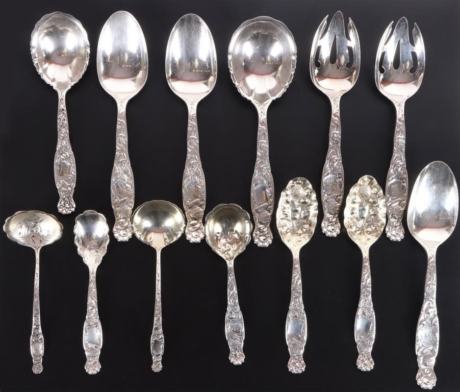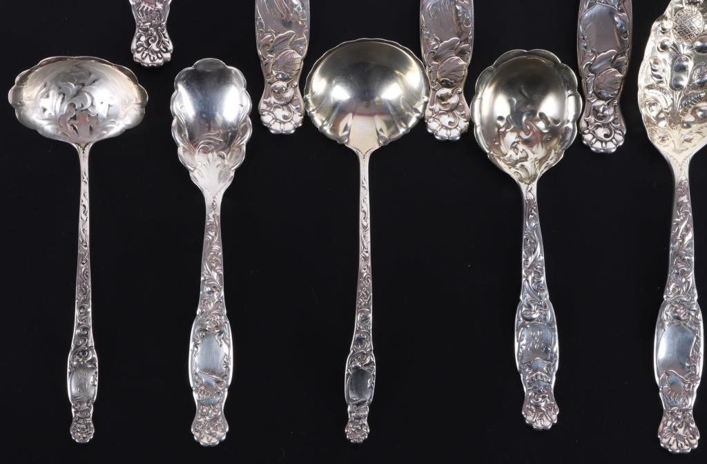 Antique Whiting Heraldic sterling silver ornate serving and decorative spoons circa 1880-1950. Set includes thirteen different types of dinner spoons for serving an assortment of foods.