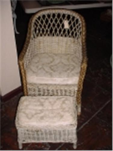 ANTIQUE WICKER CHAIR AND OTTOMAN CHAIR. 32" X 23" X 19" OTTOMAN 13" X 18.5" X 13".