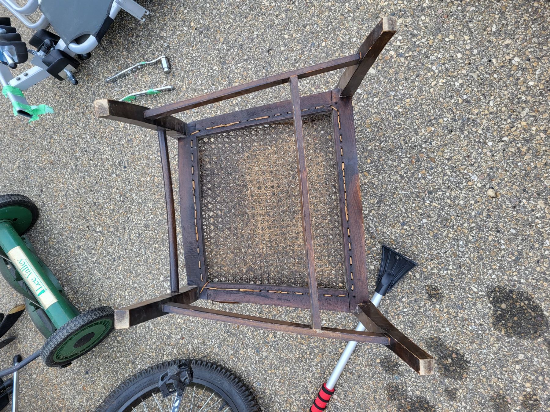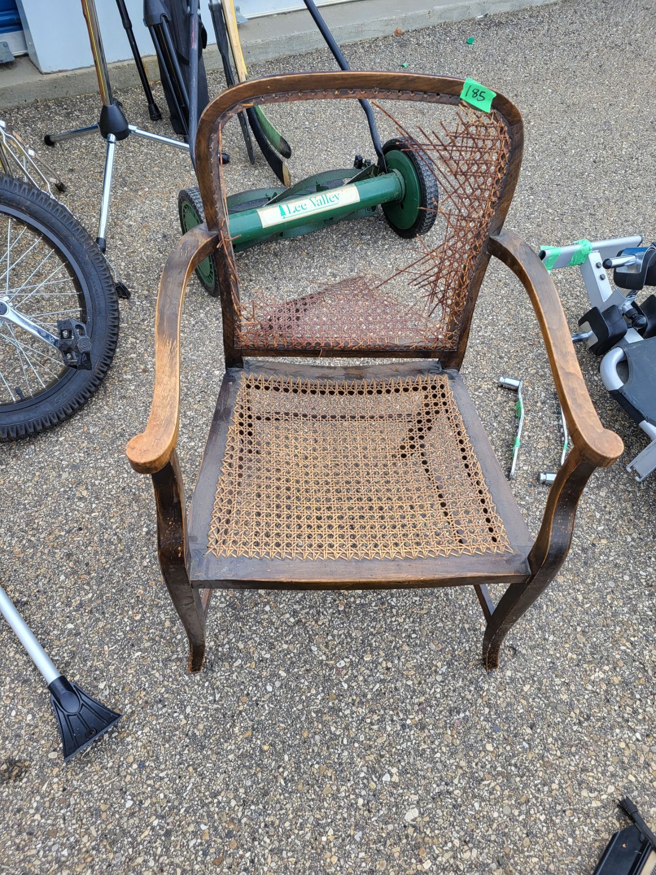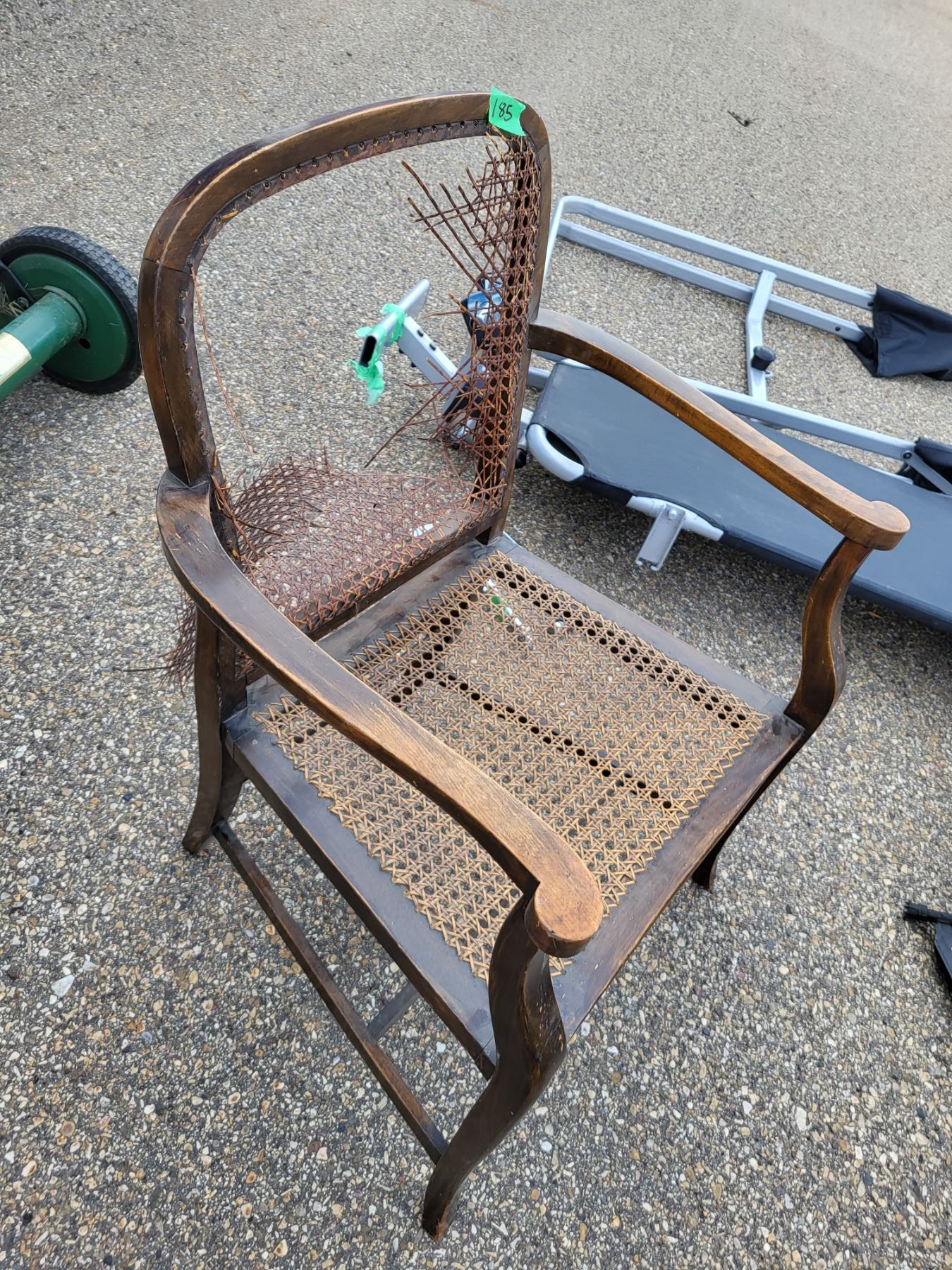 ANTIQUE WICKER CHAIR FOR REPURPOSE. LOOKS LIKE IT IS IN A BAD STATE, BUT IT ISN'T. JUST THE WEAVE IS DAMAGE. THE BONES OF THE CHAIR, ITSELF IS IN GREAT CONDITION. MEASURES 22" X 16.5" X 29.75"
