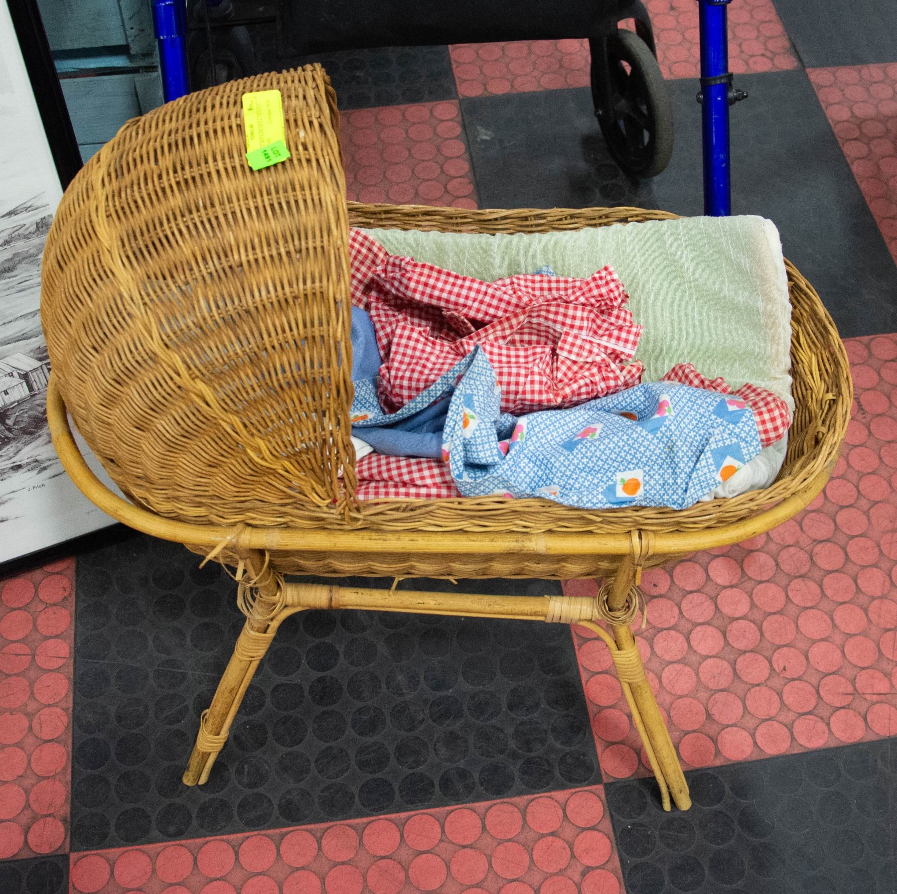 ANTIQUE WICKER DOLL CRADLE AND STAND