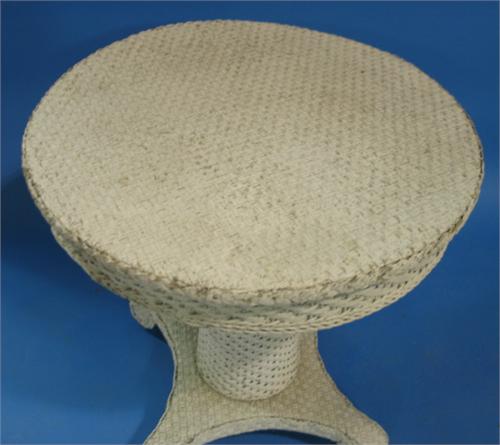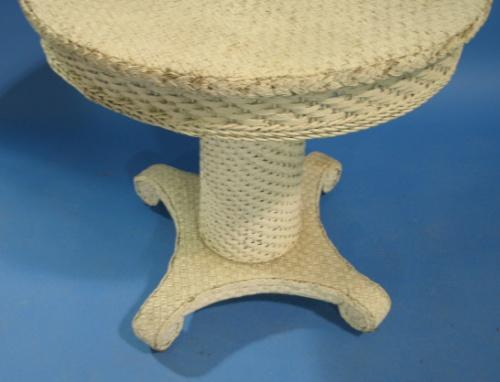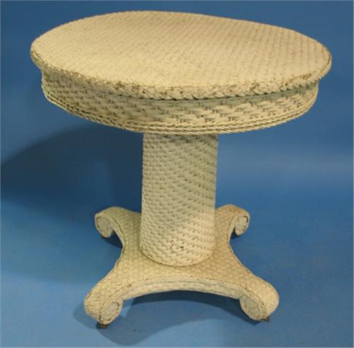 WHITE ANTIQUE WICKER EMPIRE STYLE LAMP TABLE. Over painted with white paint. Shows loss to paint throughout. Feet rest upon castors. Apron shows some minor misshaping. 27.5" H, 28.5" Dia.