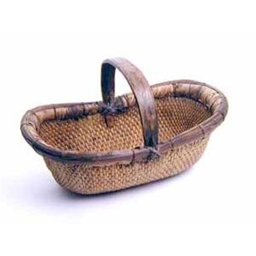 A sturdy kidney-shaped basket used in the markets and on farms in China c1910. Detailed willow weave and iron accents make each basket a unique piece