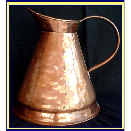 Antique large red copper wine flagon. From wine making area overseas. Probably used by wine makers.<BR>Measures 13 1/4inches high. Base is 11 3/4inches in diam.<BR>Conical shape with wide brim-like spout. Sturdy handle. Rims are rolled. Great patina. Good condition with negligible dents appropriate to the age.