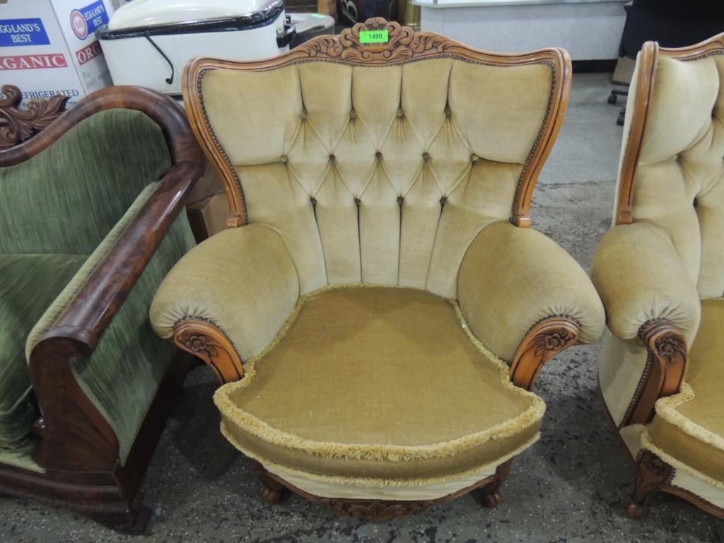 PARLOR CHAIR, VICTORIAN VELET UPHOLSTERED CHAIR, SITTING CHAIR, WINGBACK UPHOLSTERED CHAIR, AS SHOWN SEE PHOTO FOR MORE DETAILS.