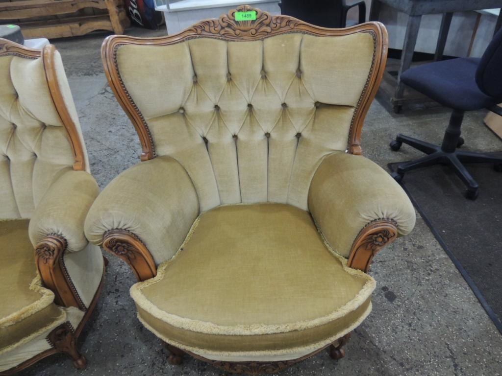 PARLOR CHAIR, VICTORIAN VELET UPHOLSTERED CHAIR, SITTING CHAIR, WINGBACK UPHOLSTERED CHAIR, AS SHOWN SEE PHOTO FOR MORE DETAILS.