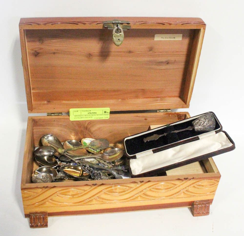 ANTIQUE WOOD BOX WITH COLLECTORS SPOONS