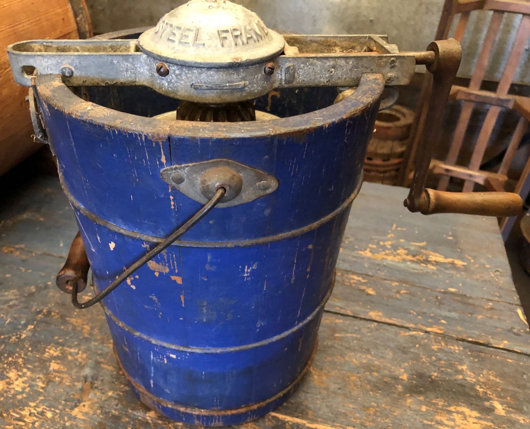 ANTIQUE WOOD ICE CREAM BUCKET WITH FROST CHURN - PAT'D 1911
