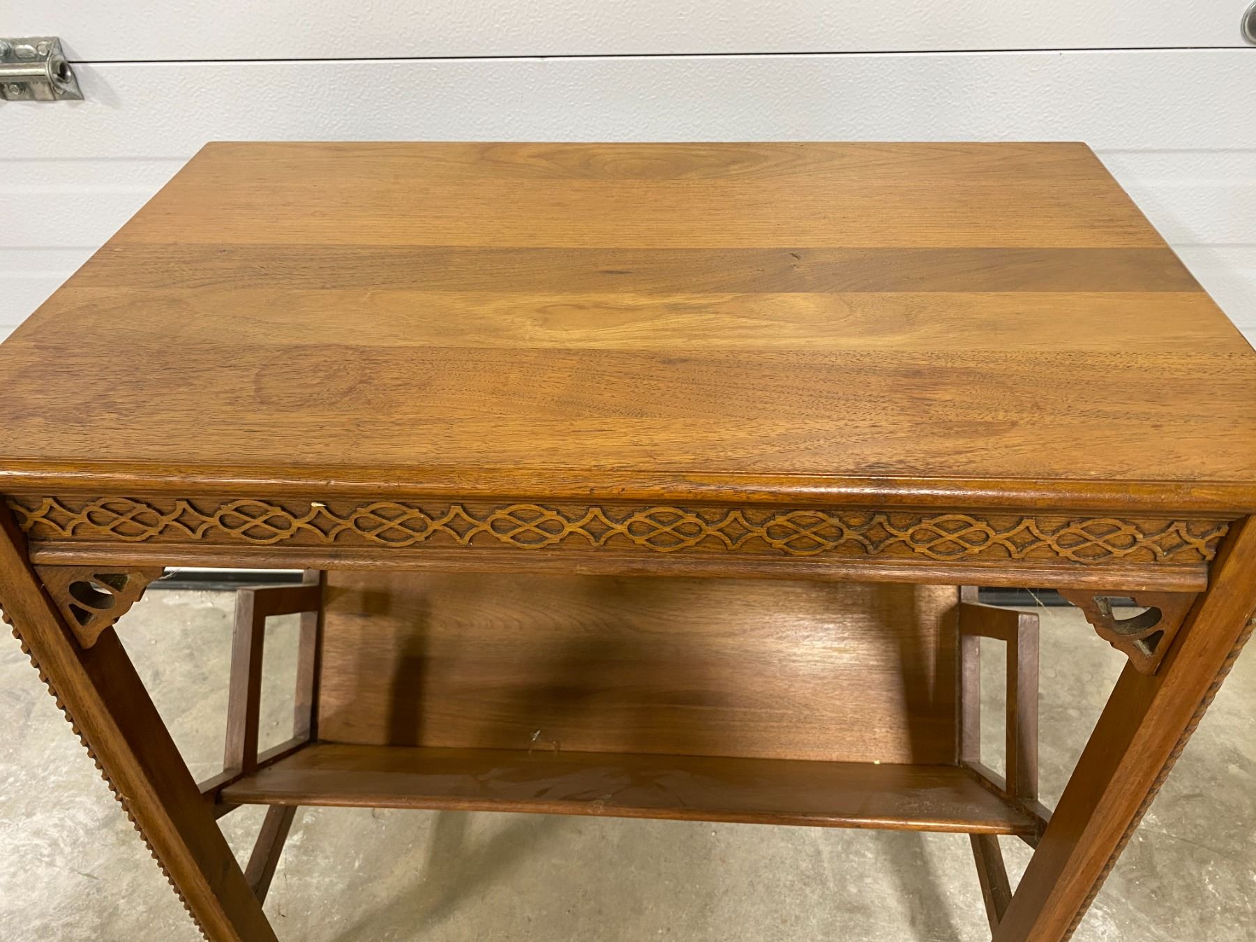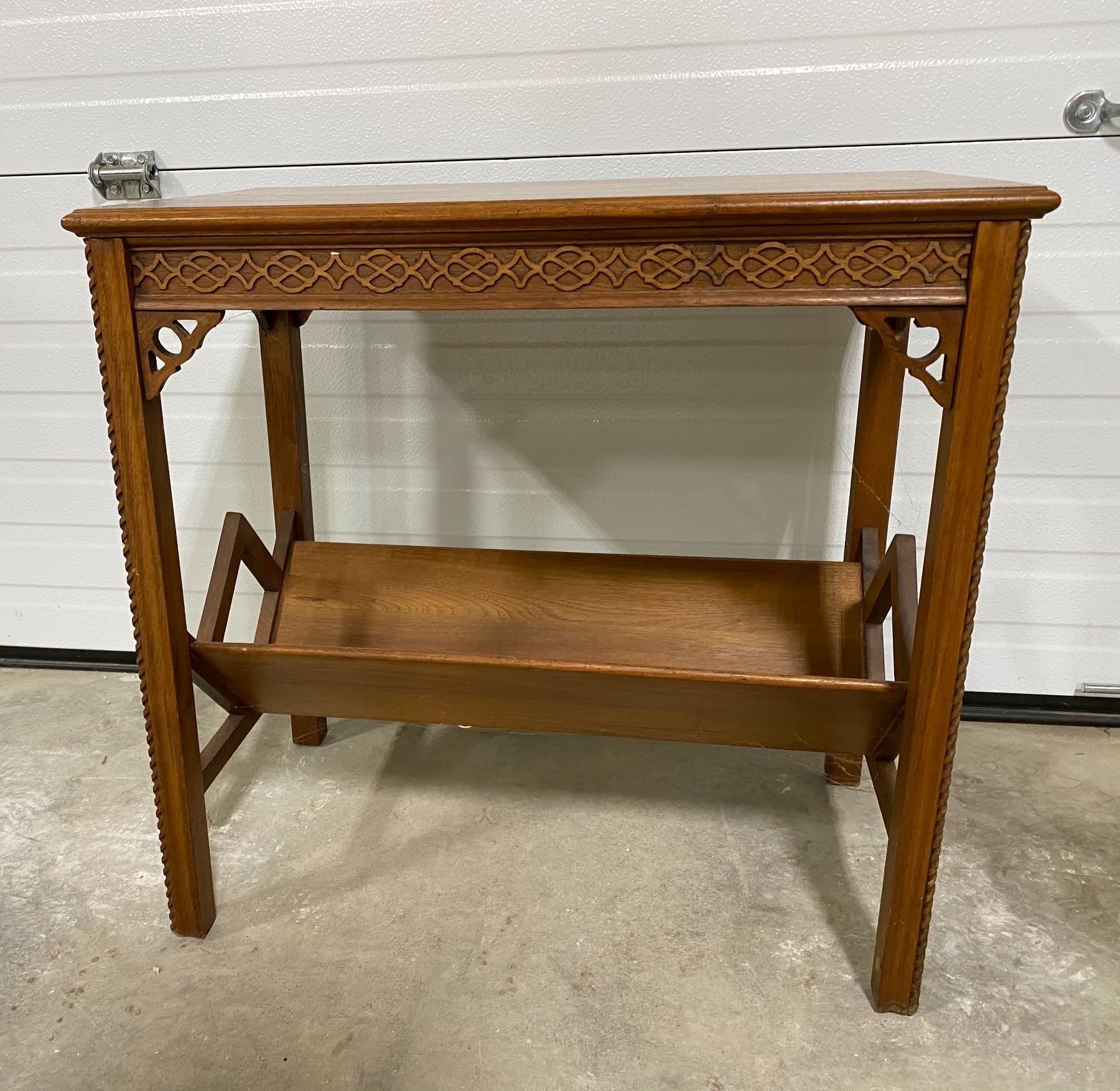 ANTIQUE WOOD SIDE TABLE WITH MAGAZINE RACK