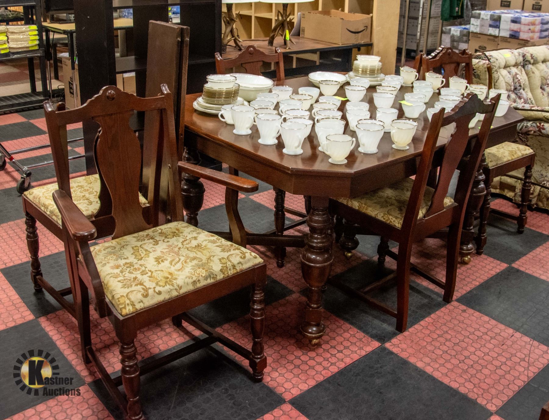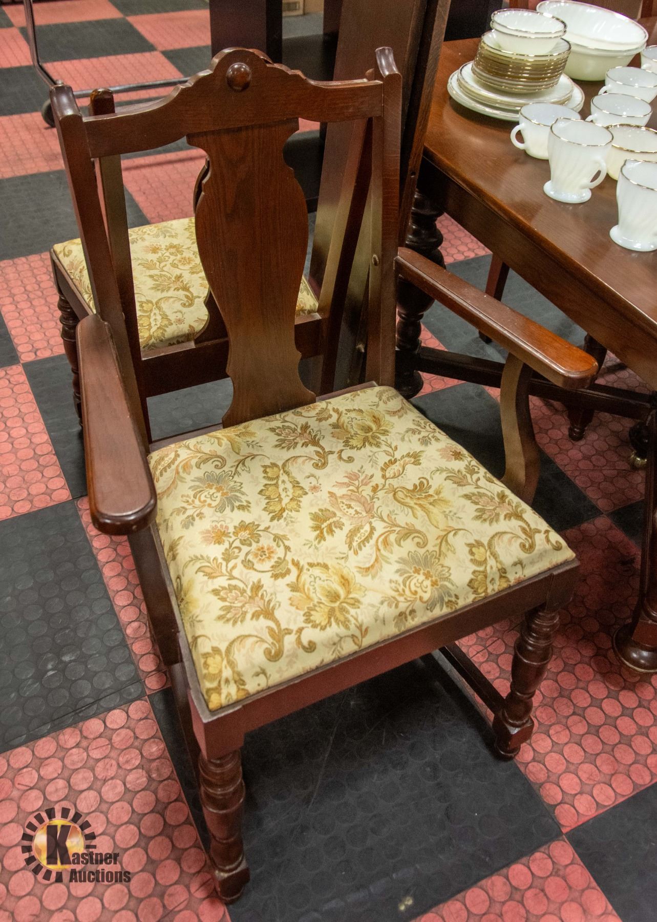 ANTIQUE WOOD TABLE WITH 6 CHAIRS, 2 LEAFS &