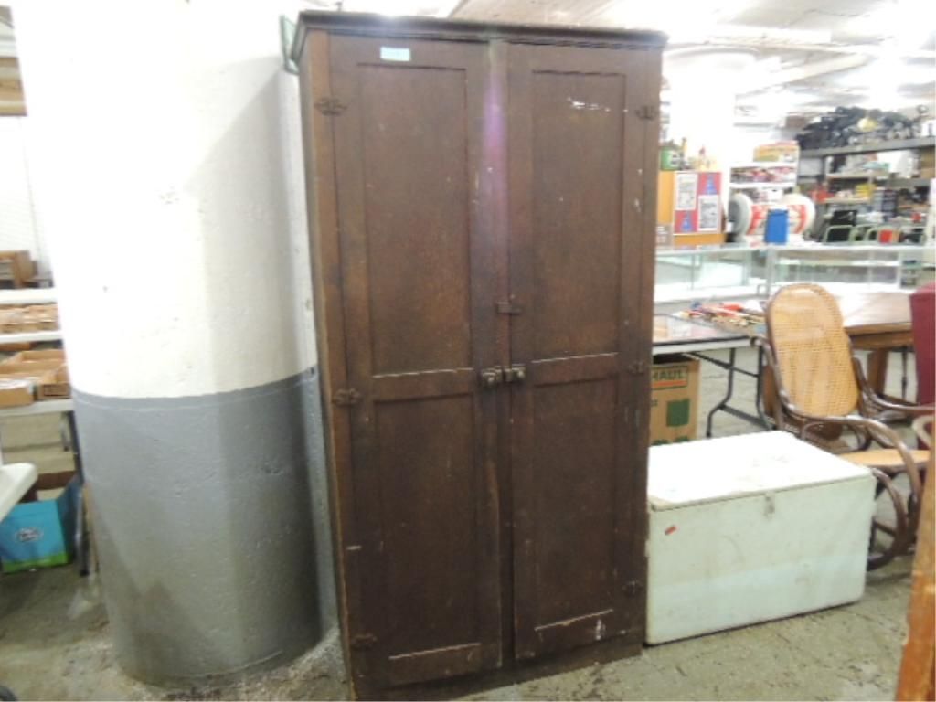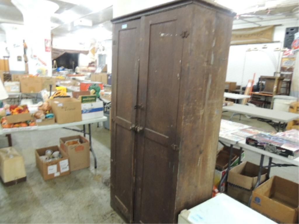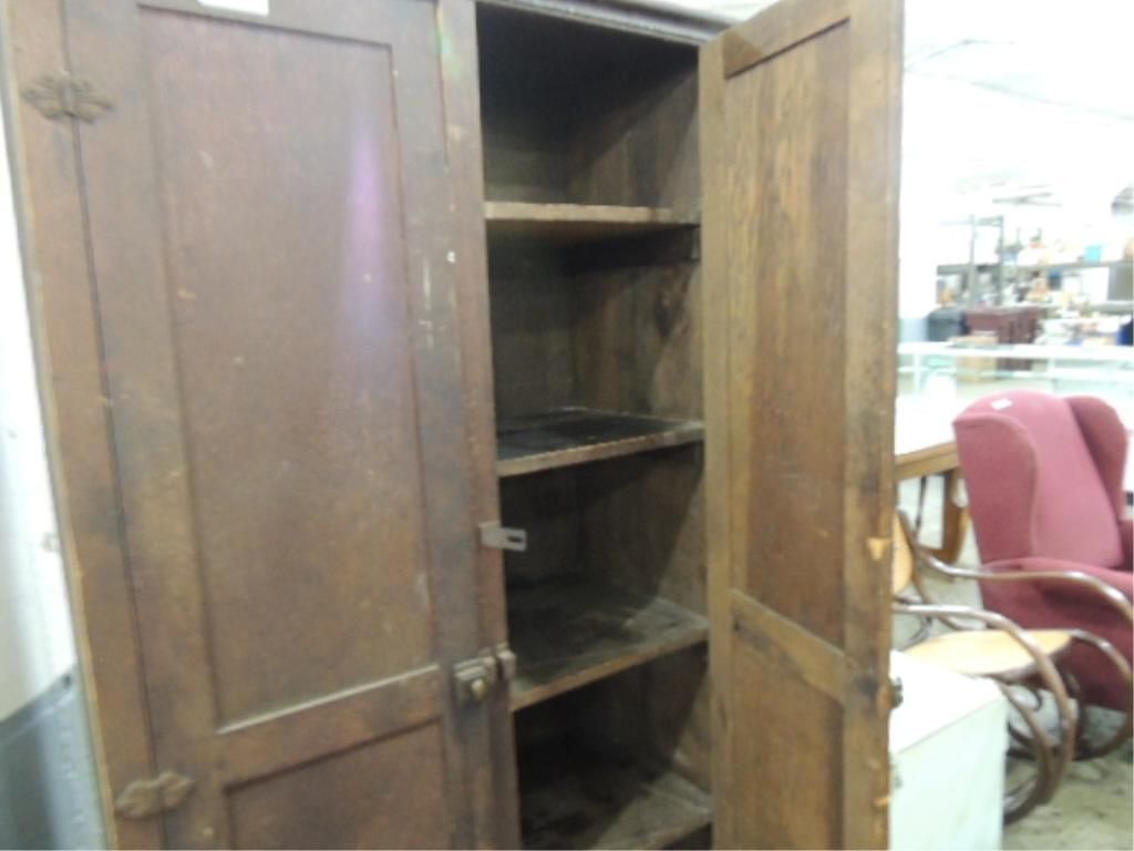 ANTIQUE TALL WOODEN WARDROBE. 5 SHELF. 36L X 72H X 16W. AS SHOWN SEE PHOTO FOR MORE DETAILS.