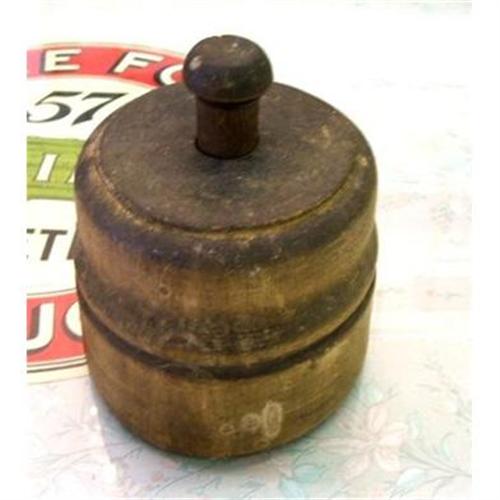 This is an antique woodenware butter mold in very good condition. The press has double acorns and leaves. It has a dark patina and a few age lines in the press. This is a three part mold and you can unscrew the handle and just display the press if you wish. It is 5" tall with the handle down and a little over 4" round. The press is 3 1/2" round.