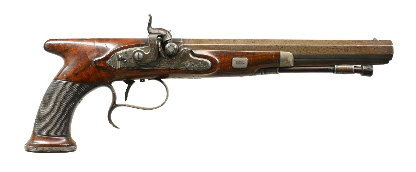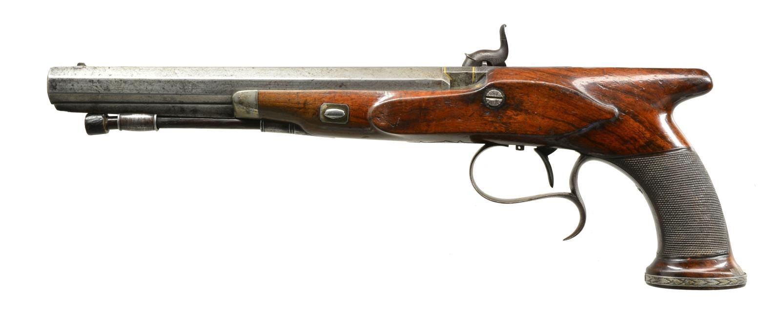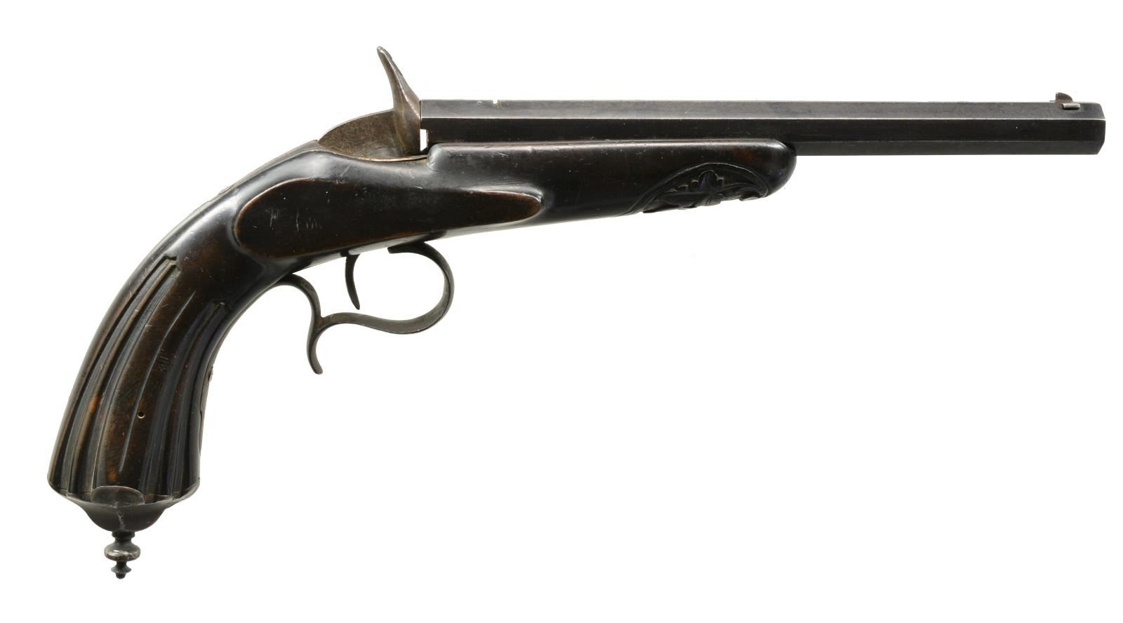1) WOOLLEY SARGANT PERCUSSION. Cal. 60. NSN. Bbl. 9 1/8" oct. w/ smooth bore. Breech section has gold finished stamp marked "LONDON" w/ gold bands on both sides. Engraved lock w/ sliding safety marked "WOOLLEY SARGANT / FAIRFAX". Engraving continues to hammer & top tang. Plain trigger. Key fastened saw handle walnut stock w/ checkered wrist. Engraved trigger guard w/ pineapple finial. Flare butt cap is fitted w/ engraved German silver band & butt has oval nameplate. German silver nose cap & key escutcheons. Rosewood ramrod held on iron under rib w/ a faceted thimble & single faceted pipe. CONDITION: metal finish has faded to gray showing very light pitting. Stock has lightly worn finish showing numerous sm. dents & scratches. Leading edge of ramrod pipe is missing half of faceted front edge. Dark pitted bore. Sound lock. (01-18056/DS). 2) FLOBERT SINGLE SHOT PARLOR. Cal. 5.5mm Flobert. NSN. Bbl. 9 1/4" oct. w/ blade front sight. Rear sight & extractor are missing. Hardwood stock w/ ornate carving on forearm & fluted grip w/ engraved iron butt cap. Engraved iron finger curl trigger guard. CONDITION: 70% dull fading blue showing spots of corrosion. Stock has worn finish w/ numerous scratches & marks & missing forearm attachment screw & escutcheon. Lightly pitted bore. (01-18057/DS). ALL ANTIQUE. $800-1,200.