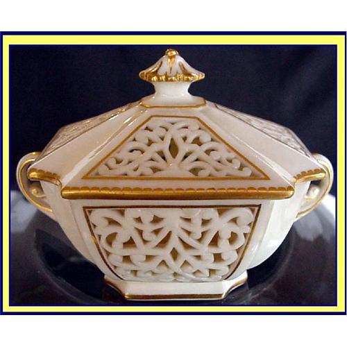 Potpourri and openwork cover made by Worcester Grainger, 1870-80 in the George Owen reticulated style.<BR>Just under 3 1/2inches high and 4 1/2inches from side to side.<BR>Exquisitely modelled in cream porcelain with scrolling handles like folded acanthus leaves, at either end. All edges gilded. Naturalistically floral-form finial with rich gilding.<BR>Openwork of cover resembles a symbolic Celtic tree and pattern of bottom openwork is also Celtic in it's interlacing overlapping design.<BR>Both lid and pot are marked with the Grainger mark used 1870-80 (no England/Made in England). <BR>Mint condition.