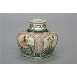 Unusual, antique Chinese porcelain, square-form jar, each side with raised figural panel, all over decorated in the wu t'sai palette, Ming mark but 17th Century Transitional Period, probably made for the Japanese Market (typical fritting); H: 6"