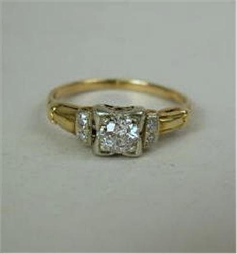 ANTIQUE YELLOW GOLD AND SMALL DIAMOND ENGAGEMENT RING, .25cts., 4 single cut diamonds, approx. 2 pts. ea., European cut center diamond flanked by a small diamond on each side