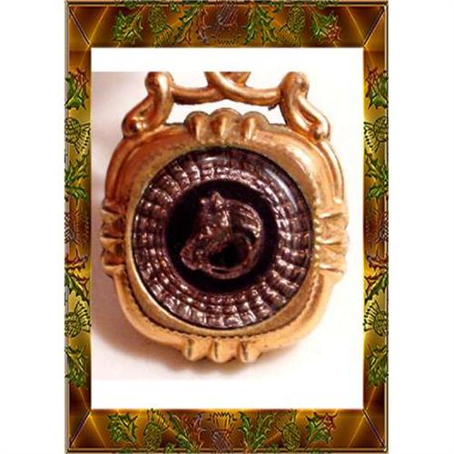 An equestrian horse fob is definitely something you don?t see every day. This is reverse painted horse under glass on one side and green onyx on the other. The frame is really fancy and it measures 1 ¼" long ( chain not included in that measurement). Great old collectible!