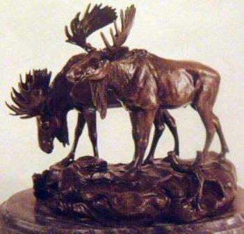 BARYE "MOOSE" BRONZE SCULPTURE,SIGNED,MINT,GREAT DETAIL AND PATINA,MOUNTED ON MARBLE,APPROX. 10HX12L