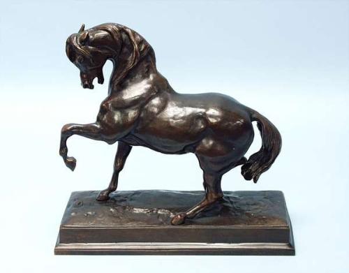 ANTOINE-LOUIS BARYE (1796-1875) French Animalier school. "Cheval Turc". A finely cast brown patinated bronze figure of a prancing horse. Signed on rectangular naturalistic base. Illustrated in J. Horswell: "Les Animaliers", page 39. Ref. Benezit, vol. 1, p. 440. 3000-3500