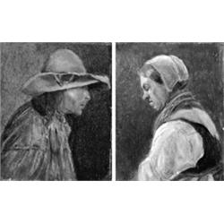 Brustbild eines Bauern im Profil nach rechts - Bildnis einer Bauersfrau nach links, den Blick gesenkt haltend. Gegenstücke. 2 Oelgemälde auf Holz. - Beide unleserlich <U>signiert</U>. Größen: 12,5 x 9 und 12,5 x 10 cm. Mit schwachen Bereibungen. Gerahmt.