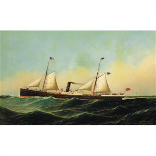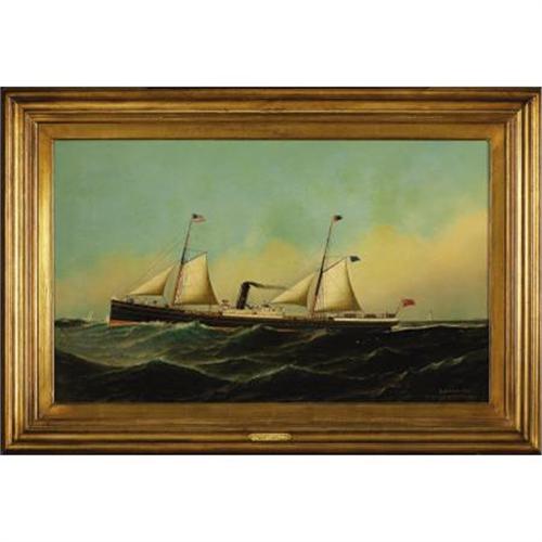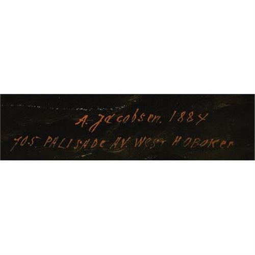 <B>ANTONIO NICOLO GASPARO JACOBSEN (American, 1850-1921)</B></I><BR><I>Ship 'Jona'</B></I>, 1884<BR>Oil on canvas<BR>22-1/4 x 36-1/4 inches (56.5 x 92.1 cm)<BR>Signed lower right: <I>A. Jacobsen 1884 / 70.5 Palisade Av. West Hoboken</B></I><BR> <B>Condition Report:</B> Normal wear commensurate with age, cleaned and relined, with some areas of strengthening<BR><BR><b>Shipping:</b> Requires 3rd Party Shipping (<a target="_blank" href="http://www.heritageauctions.com/common/shipping.php">view shipping information</a>)